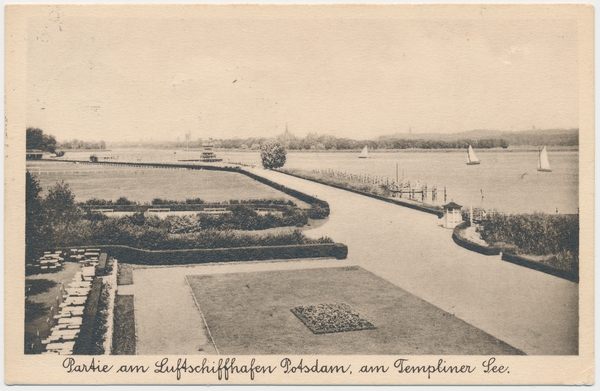 Text auf der Karte: Partie am Luftschiffhafen Potsdam, am Templiner See. Entstehungszeit der Karte: gestempelt Potsdam 30.05.1935 Straße und Hausnummer: Am Templiner See Kartenart: Ansichtskarte Kartentechnik: Kupfertiefdruck Verlag: Graphische Kunstanstalt Max O'Brien, Berlin-Steglitz, Plantagenstraße 3 Gelaufen/ungelaufen: gelaufen Zustand (I=sehr gut bis V=mangelhaft): I Häufigkeit (h=häufig bis rrr=sehr selten): r Heutige(r) Straßenname(n): Am Luftschiffhafen