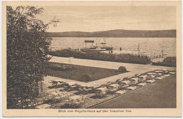 Text auf der Karte: Blick vom Regatta-Haus auf den Templiner See Entstehungszeit der Karte: gestempelt Potsdam (unleserlich) Straße und Hausnummer: Am Templiner See Kartenart: Ansichtskarte Kartentechnik: Kupfertiefdruck Verlag: Atelier John, Falkenhain-Finkenkrug Gelaufen/ungelaufen: gelaufen Zustand (I=sehr gut bis V=mangelhaft): I Häufigkeit (h=häufig bis rrr=sehr selten): r Heutige(r) Straßenname(n): Am Luftschiffhafen