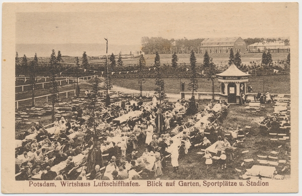 Text auf der Karte: Wirtshaus zum Luftschiffhafen Potsdam. Inh. Waldemar Gericke. "Blick auf Garten, Sportplätze u. Stadion" (unbeschriebenes Expl.) Entstehungszeit der Karte: ca. 1927 Straße und Hausnummer: Zeppelinstraße 63 Kartenart: Ansichtskarte Kartentechnik: Kupfertiefdruck Verlag: 656 Foto u. Verlag Max Hochgeladen, Potsdam Gelaufen/ungelaufen: ungelaufen Zustand (I=sehr gut bis V=mangelhaft): I Häufigkeit (h=häufig bis rrr=sehr selten): r Heutige(r) Straßenname(n): Am Luftschiffhafen Zeppelinstraße (Potsdam-West)