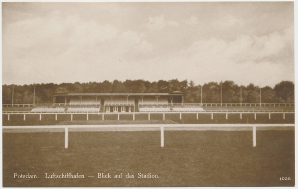 Text auf der Karte: Potsdam. Luftschiffhafen - Blick auf das Stadion. Entstehungszeit der Karte: ca. 1930 Kartenart: Ansichtskarte Kartentechnik: SW-Foto Verlag: Verlag Piek, Potsdam Gelaufen/ungelaufen: ungelaufen Zustand (I=sehr gut bis V=mangelhaft): I Häufigkeit (h=häufig bis rrr=sehr selten): r Heutige(r) Straßenname(n): Am Luftschiffhafen Kommentar: Am 09.09.1911 landet das erste Luftschiff im Potsdamer Luftschiffhafen. Im November 1912 wird die größte Luftschiffhalle der Welt auf der Zeppelinwerft in Potsdam fertiggestellt. 1922 erfolgt der Abbruch der Halle und der Werft.
