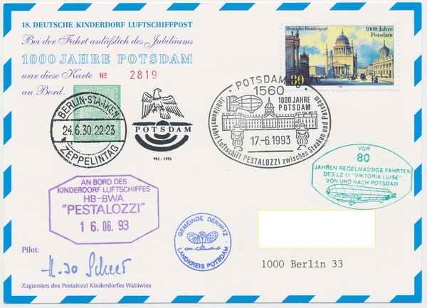 Text auf der Karte: Karte mit Sonderstempel Jubiläumsfahrt Luftschiff Pezzalozzi zwischen Staaken und Potsdam Entstehungszeit der Karte: gestempelt Potsdam 17.06.1993 Kartenart: Ansichtskarte Kartentechnik: Farbdruck Verlag: unbekannt Gelaufen/ungelaufen: gelaufen Zustand (I=sehr gut bis V=mangelhaft): I Häufigkeit (h=häufig bis rrr=sehr selten): r Heutige(r) Straßenname(n): Am Luftschiffhafen