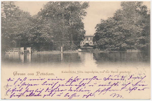 Text auf der Karte: Gruss aus Potsdam. Kaiserliche Villa Ingeheim von der Havel gesehen. Entstehungszeit der Karte: gestempelt Potsdam 18.10.1900 Straße und Hausnummer: Zeppelinstraße Kartenart: Ansichtskarte Kartentechnik: SW-Litho Verlag: L. S. B. 504. L. Saalfeld, Berlin S. W. 29 Gelaufen/ungelaufen: gelaufen Zustand (I=sehr gut bis V=mangelhaft): I Häufigkeit (h=häufig bis rrr=sehr selten): r Heutige(r) Straßenname(n): Zeppelinstraße (Potsdam-West)