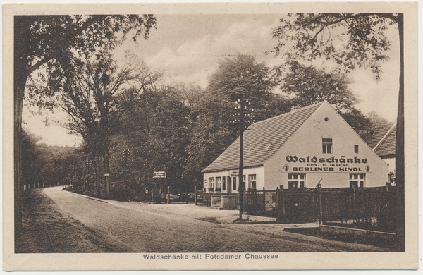 Text auf der Karte: Restaurant zur Waldschänke Bes. Ernst Waese Nedlitz-Neu-Fahrland b. Potsdam Haltestelle der Postautos - Fernruf 2973