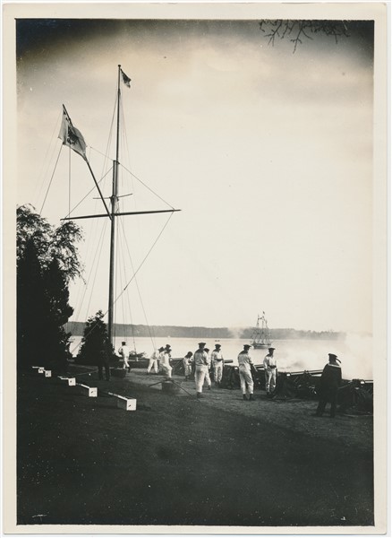 Text auf der Karte: Potsdam. Matrosenstation Salutschießen. Entstehungszeit der Karte: ca. 1900 Straße und Hausnummer: Schwanenallee Kartenart: Ansichtskartenvorlage 13x18 Kartentechnik: SW-Foto Verlag: Max Hochgeladen, Potsdam Gelaufen/ungelaufen: ungelaufen Zustand (I=sehr gut bis V=mangelhaft): I Häufigkeit (h=häufig bis rrr=sehr selten): r Heutige(r) Straßenname(n): Schwanenallee Kommentar: In der Mitte der Schwanenallee entstand 1843 ein Bootshaus und eine Matrosenstation für königliche Wasserfahrzeuge. Professor Slaby gelang 1897 eine erste drahtlose Nachrichtenübermittlung zur Heilandskirche in Sacrow (Sender - Empfänger). (Quelle: Griep, Otto (Hrsg.) Potsdam in alten Ansichtskarten, Würzburg 1992, Seite 28)