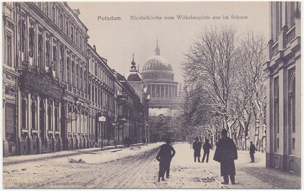 Text auf der Karte: Potsdam Nicolaikirche vom Wilhelmplatz aus im Schnee