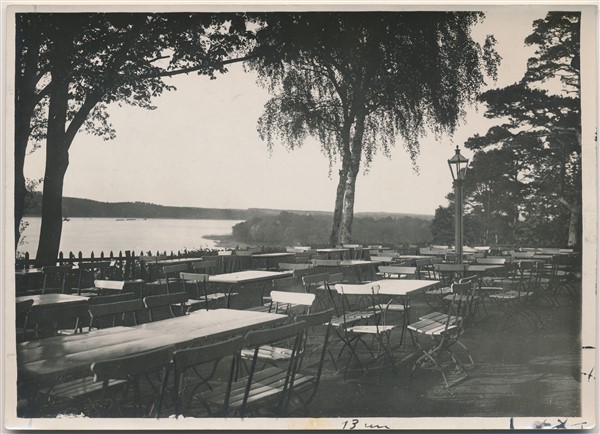 Text auf der Karte: Fernsicht auf die Pfaueninsel vom Blockhaus-Restaurant Nikolskoe