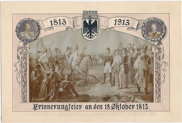 Text auf der Karte: 1813 1913 Erinnerungsfeier an der 18. Oktober 1813. veranstaltet von den städtischen Körperschaften 18. Oktober 1913 Entstehungszeit der Karte: 1913 Kartenart: Ansichtskartenvorlage 14,5x21,5 Kartentechnik: SW-Foto Verlag: wohl Max Hochgeladen Gelaufen/ungelaufen: ungelaufen Zustand (I=sehr gut bis V=mangelhaft): I Häufigkeit (h=häufig bis rrr=sehr selten): r
