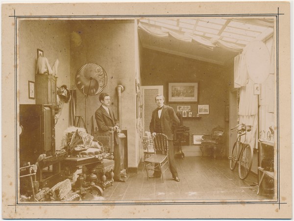 Text auf der Karte: Max Hochgeladen (links) und Karl Nürrenbach in einem Fotoatelier Entstehungszeit der Karte: ca. 1895 Kartenart: Foto 19x14,2 Kartentechnik: SW-Foto Verlag: unbekannt Gelaufen/ungelaufen: ungelaufen Zustand (I=sehr gut bis V=mangelhaft): I Häufigkeit (h=häufig bis rrr=sehr selten): rrr