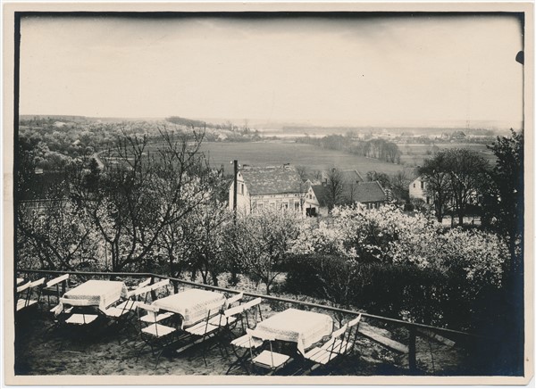 Text auf der Karte: Blick vom Restaurant zur Bergmeierei Entstehungszeit der Karte: ca. 1920 Kartenart: Ansichtskartenvorlage 13x18 Kartentechnik: SW-Foto Verlag: Max Hochgeladen, Potsdam Gelaufen/ungelaufen: ungelaufen Zustand (I=sehr gut bis V=mangelhaft): I Häufigkeit (h=häufig bis rrr=sehr selten): r Heutige(r) Straßenname(n): Zur Bergmeierei (Geltow)