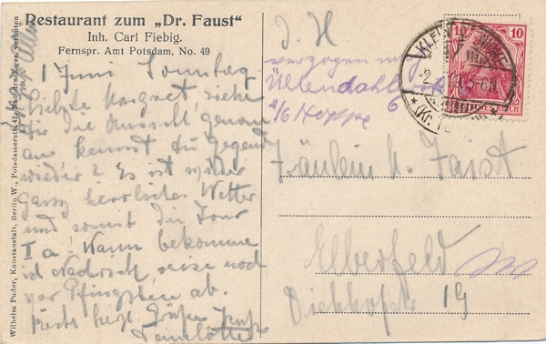 Text auf der Karte: Abfahrt des Sterndampfers von Sakrow Entstehungszeit der Karte: gestempelt Klein-Glienicke 1919 Kartenart: Ansichtskarte Kartentechnik: SW-Litho Verlag: Wilhelm Puder, Kunstanstalt, Berlin W., Potsdamerstr. 42 Gelaufen/ungelaufen: gelaufen Zustand (I=sehr gut bis V=mangelhaft): II Häufigkeit (h=häufig bis rrr=sehr selten): h