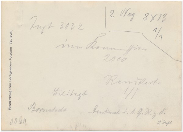 Text auf der Karte: Bornstedt Denkmal d. 1. G.-R. z. F. (Denkmal für die Gefallenen des 1. Garde-Regiments zu Fuß von 1870/71) Entstehungszeit der Karte: ca. 1910 Kartenart: Ansichtskartenvorlage 12,7x18 Kartentechnik: sw-foto Verlag: Photo-Verlag Max Hochgeladen, Potsdam, Tel. 1804 Gelaufen/ungelaufen: ungelaufen Zustand (I=sehr gut bis V=mangelhaft): I Häufigkeit (h=häufig bis rrr=sehr selten): r Kommentar: Auf den Schießständen der Garde im Katharinenholz in Bornstedt befand sich bis 1945 das Denkmal für die Gefallenen des 1. Garde-Regiments zu Fuß aus dem Deutsch-Französischen Krieg von 1879/71. Dieses Denkmal wurde 1872 von den Regierungsangehörigen gestiftet. Reste des Denkmals fanden sich im Katharinenholz an der Amundsenstraße (Potsdamer Neueste Nachrichten, 05.01.2008. S. 10) (Quelle: Bauer, Frank u. Knitter, Hartmut u. Ruppert, Heinz Vernichtet - Vergessen - Verdrängt Militärbauten und militärische Denkmäler in Potsdam, Verlag E. S. Mittler & Sohn, Berlin, Bonn, Herford, 1993, Seite 152)