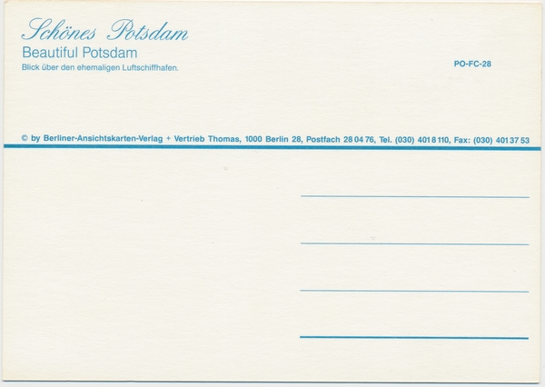 Text auf der Karte: Schönes Potsdam. Blick über den ehemaligen Luftschiffhafen. Entstehungszeit der Karte: ca. 2000 Straße und Hausnummer: Am Templiner See Kartenart: Ansichtskarte Kartentechnik: Farbdruck Verlag: Berliner Ansichtskartenverlag Gelaufen/ungelaufen: ungelaufen Zustand (I=sehr gut bis V=mangelhaft): I Häufigkeit (h=häufig bis rrr=sehr selten): h