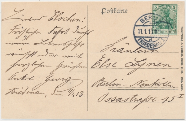 Text auf der Karte: Das im Potsdamer Luftschiffhafen stationierte Passagier-Luftschiff Hansa (mit Stempelspur) Entstehungszeit der Karte: gestempelt Berlin 11.01.1913 Straße und Hausnummer: Am Templiner See Kartenart: Ansichtskarte Kartentechnik: SW-Litho Verlag: Kunstverlag J. Goldiner, Berlin C.25 Orig.-Aufn. Gelaufen/ungelaufen: gelaufen Zustand (I=sehr gut bis V=mangelhaft): I Häufigkeit (h=häufig bis rrr=sehr selten): r Heutige(r) Straßenname(n): Am Luftschiffhafen Kommentar: Am 09.09.1911 landet das erste Luftschiff im Potsdamer Luftschiffhafen. Im November 1912 wird die größte Luftschiffhalle der Welt auf der Zeppelinwerft in Potsdam fertiggestellt. 1922 erfolgt der Abbruch der Halle und der Werft.