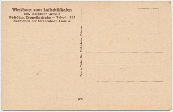 Text auf der Karte: Wirtshaus zum Luftschiffhafen Potsdam. Inh. Waldemar Gericke. "Blick auf Garten, Sportplätze u. Stadion" (unbeschriebenes Expl.) Entstehungszeit der Karte: ca. 1927 Straße und Hausnummer: Zeppelinstraße 63 Kartenart: Ansichtskarte Kartentechnik: Kupfertiefdruck Verlag: 656 Foto u. Verlag Max Hochgeladen, Potsdam Gelaufen/ungelaufen: ungelaufen Zustand (I=sehr gut bis V=mangelhaft): I Häufigkeit (h=häufig bis rrr=sehr selten): r Heutige(r) Straßenname(n): Am Luftschiffhafen Zeppelinstraße (Potsdam-West)