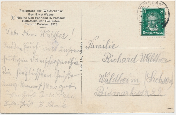 Text auf der Karte: Gruß aus der Waldschänke rückseitig: Bes. Ernst Waase, Neu-Fahrland b. Potsdam Haltestelle der Postautos. Fernsprecher Potsdam 2973. Entstehungszeit der Karte: gestempelt Potsdam 1928 Straße und Hausnummer: Am Wiesenrand 10 Kartenart: Ansichtskarte Kartentechnik: Kupfertiefdruck Verlag: Atelier John, Falkenhain Gelaufen/ungelaufen: gelaufen Zustand (I=sehr gut bis V=mangelhaft): I Häufigkeit (h=häufig bis rrr=sehr selten): r Heutige(r) Straßenname(n): Am Wiesenrand