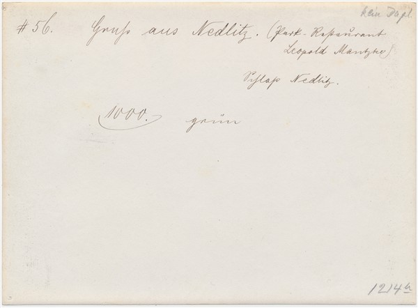 Text auf der Karte: Gruß aus Nedlitz. (Park-Restaurant Leopold Manzke) Schloß Nedlitz. Entstehungszeit der Karte: ca. 1915 Straße und Hausnummer: Nedlitzer Straße Kartenart: Ansichtskartenvorlage 13x18 Kartentechnik: SW-Foto Verlag: Max Hochgeladen, Potsdam, 56. Gelaufen/ungelaufen: ungelaufen Zustand (I=sehr gut bis V=mangelhaft): I Häufigkeit (h=häufig bis rrr=sehr selten): r Heutige(r) Straßenname(n): Nedlitzer Straße