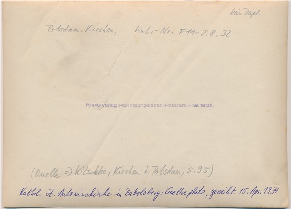 Text auf der Karte: Nowawes St. Antonius-Kirche Entstehungszeit der Karte: ca. 1910 Straße und Hausnummer: Plantagenstraße Kartenart: Ansichtskartenvorlage 12,7x18 Kartentechnik: SW-Foto Verlag: Max Hochgeladen, Potsdam Gelaufen/ungelaufen: ungelaufen Zustand (I=sehr gut bis V=mangelhaft): I Häufigkeit (h=häufig bis rrr=sehr selten): r Heutige(r) Straßenname(n): Weberplatz Kommentar: Mit dem Bau der für die neue Kolonie "Nowawes" benötigten Kirche wurde 1752 der holländische Baumeister Jan Boumann beauftragt. (Quelle: Potsdam-Museum (Herausgeber) Neuendorf - Nowawes - Babelsberg auf historischen Ansichtskarten, Potsdam 2004, Seite 60)