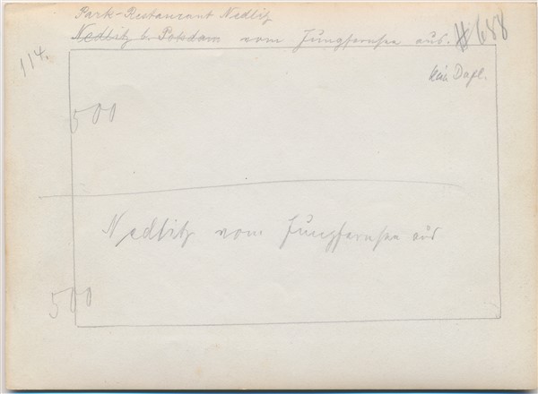 Text auf der Karte: Park-Restaurant Nedlitz vom Jungfernsee aus. Entstehungszeit der Karte: ca. 1920 Straße und Hausnummer: Nedlitzer Straße Kartenart: Ansichtskartenvorlage 13x18 Kartentechnik: SW-Foto Verlag: Max Hochgeladen, Potsdam, 56. Gelaufen/ungelaufen: ungelaufen Zustand (I=sehr gut bis V=mangelhaft): I Häufigkeit (h=häufig bis rrr=sehr selten): r Heutige(r) Straßenname(n): Nedlitzer Straße