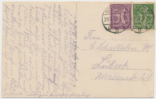 Text auf der Karte: Sanatorium Bergstücken bei Neubabelsberg. Entstehungszeit der Karte: gestempelt Berlin 29.07.1922 Straße und Hausnummer: In der Aue 69/71 Kartenart: Ansichtskarte Kartentechnik: SW-Litho Verlag: Photo-Mehlis, Berlin N, Danziger Str. 86. Nr. 231 Gelaufen/ungelaufen: gelaufen Zustand (I=sehr gut bis V=mangelhaft): I Häufigkeit (h=häufig bis rrr=sehr selten): h Heutige(r) Straßenname(n): In der Aue Hubertusdamm Kommentar: Die 1907 als "Waldsanatorium" (in der Aue) erbaute Erholungs- und Pflegeeinrichtung übernahm zu Zeiten des Ersten Weltkrieges die Funktion eines Lazaretts. (Quelle: Potsdam-Museum (Herausgeber) Neuendorf - Nowawes - Babelsberg auf historischen Ansichtskarten, Potsdam 2004, Seite 96)