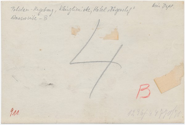 Text auf der Karte: Klein-Glienicke (Wasserseite Bürgershof) Entstehungszeit der Karte: ca. 1915 Straße und Hausnummer: Kurfürstenstraße (Klein-Glienicke) 4/5 Kartenart: Ansichtskartenvorlage 13x18 Kartentechnik: SW-Foto Verlag: Max Hochgeladen, Potsdam Gelaufen/ungelaufen: ungelaufen Zustand (I=sehr gut bis V=mangelhaft): I Häufigkeit (h=häufig bis rrr=sehr selten): r Heutige(r) Straßenname(n): Waldmüllerstraße