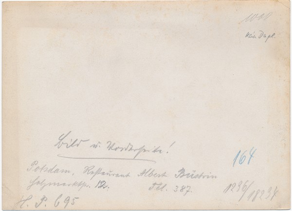 Text auf der Karte: Restaurant Albert Büstrin Entstehungszeit der Karte: ca. 1915 Straße und Hausnummer: Holzmarktstraße 12 Kartenart: Ansichtskartenvorlage 13x18 Kartentechnik: SW-Foto Verlag: Max Hochgeladen, Potsdam Gelaufen/ungelaufen: ungelaufen Zustand (I=sehr gut bis V=mangelhaft): I Häufigkeit (h=häufig bis rrr=sehr selten): rr Heutige(r) Straßenname(n): Holzmarktstraße