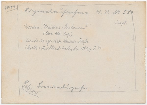 Text auf der Karte: Potsdam. Brandenburgerstr (Residenz-Restaurant) Entstehungszeit der Karte: ca. 1915 Straße und Hausnummer: Nauener Str. 14/15 Kartenart: Ansichtskartenvorlage 12,7x18 Kartentechnik: SW-Foto Verlag: Max Hochgeladen, Potsdam Gelaufen/ungelaufen: ungelaufen Zustand (I=sehr gut bis V=mangelhaft): I Häufigkeit (h=häufig bis rrr=sehr selten): r Heutige(r) Straßenname(n): Brandenburger Straße Friedrich-Ebert-Straße (Nördliche Innenstadt)