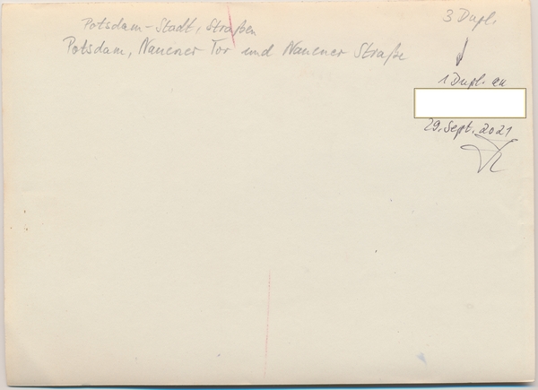 Text auf der Karte: Blick von der Nauener Straße zum Nauener Tor Entstehungszeit der Karte: ca. 1925 Straße und Hausnummer: Nauener Straße Kartenart: Ansichtskartenvorlage 13x18 Kartentechnik: SW-Foto Verlag: Max Hochgeladen, Potsdam Gelaufen/ungelaufen: ungelaufen Zustand (I=sehr gut bis V=mangelhaft): I Häufigkeit (h=häufig bis rrr=sehr selten): r Heutige(r) Straßenname(n): Friedrich-Ebert-Straße (Nördliche Innenstadt) Nauener Tor