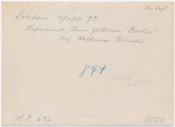 Text auf der Karte: Potsdam Schloss-Strasse 9a Restaurant "Zum goldenen Becher" (Inh. Waldemar Gericke)