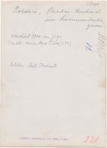 Text auf der Karte: Potsdam, Steuben-Denkmal im Kommandantur-Garten Entstehungszeit der Karte: ca. 1915 Straße und Hausnummer: Schloß-Straße 9a Kartenart: Ansichtskartenvorlage 13x18 Kartentechnik: SW-Foto Verlag: Max Hochgeladen Gelaufen/ungelaufen: ungelaufen Zustand (I=sehr gut bis V=mangelhaft): I Häufigkeit (h=häufig bis rrr=sehr selten): r Heutige(r) Straßenname(n): Schloßstraße Kommentar: Die Beschriftung lautet: DEM DEUTSCHEN KAISER / UND DEM DEUTSCHEN VOLKE / GEWIDMET VOM KONGRESS / DER VEREINIGTEN STAATEN / VON AMERIKA ALS WAHRZEICHEN / UNUNTERBROCHENER FREUNDSCHAFT / NACHBILDUNG DES DENKMALS FÜR / GENERAL FRIEDRICH WILHELM / AUGUST VON STEUBEN / GEBOREN IN MAGDEBURG 1730 / GESTORBEN IM STAATE NEW YORK 1794 / ERRICHTET in WASHINGTON / IN DANKBARER ANERKENNUNG / SEINER VERDIENSTE IM FREIHEITS- / KAMPF DES AMERIKANISCHEN VOLKES / MCMXI