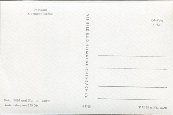 Text auf der Karte: Potsdam - Garnisonkirche I Entstehungszeit der Karte: ca. 1963 Straße und Hausnummer: Breite Straße 7 Kartenart: Ansichtskarte Kartentechnik: SW-Foto Verlag: VEB BILD UND HEIMAT REICHENBACH I. V. Gelaufen/ungelaufen: ungelaufen Zustand (I=sehr gut bis V=mangelhaft): I Häufigkeit (h=häufig bis rrr=sehr selten): h Heutige(r) Straßenname(n): Breite Straße (Nördliche Innenstadt)