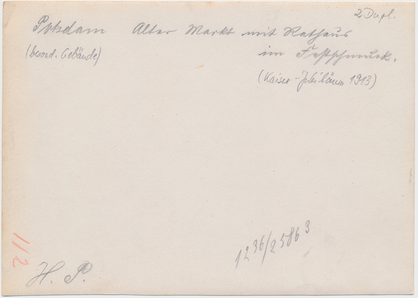 Text auf der Karte: Potsdam. Alter Markt mit dem Rathaus . Festschmuck zum 25-järigen Tronjubiläum Entstehungszeit der Karte: ca. 1913 Straße und Hausnummer: Alter Markt Kartenart: Ansichtskartenvorlage 13x18 Kartentechnik: SW-Foto Verlag: Max Hochgeladen, Potsdam Gelaufen/ungelaufen: ungelaufen Zustand (I=sehr gut bis V=mangelhaft): I Häufigkeit (h=häufig bis rrr=sehr selten): rrr Heutige(r) Straßenname(n): Am alten Markt