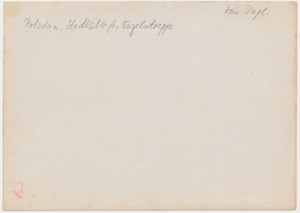 Text auf der Karte: Engelstreppe am Stadtschloß Entstehungszeit der Karte: ca. 1910 Straße und Hausnummer: Alter Markt 1 Kartenart: Ansichtskarenvorlage 13x18 Kartentechnik: SW-Foto Verlag: Max Hochgeladen, Potsdam Gelaufen/ungelaufen: ungelaufen Zustand (I=sehr gut bis V=mangelhaft): I Häufigkeit (h=häufig bis rrr=sehr selten): rrr Heutige(r) Straßenname(n): Alter Markt