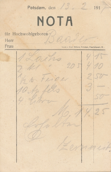 Text auf der Karte: Geschäftskarte mit Rechnung von Hugo Zeruneit Nchf. Spezial-Haus Feiner Delikatessen Entstehungszeit der Karte: beschrieben Potsdam 13.02.1917 Straße und Hausnummer: Am Kanal 45 Kartenart: Geschäftskarte Kartentechnik: Druck Verlag: Druck v. Ernst Webers, Potsdam, Charlottenstr. 15 Gelaufen/ungelaufen: gelaufen Zustand (I=sehr gut bis V=mangelhaft): II Häufigkeit (h=häufig bis rrr=sehr selten): r Heutige(r) Straßenname(n): Am Kanal