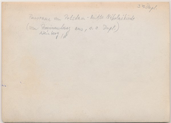 Text auf der Karte: Potsdam vom Ruinenberg aus mit Nicolaikirche. Entstehungszeit der Karte: ca. 1910 Kartenart: Ansichtskartenvorlage 13x18 Kartentechnik: SW-Foto Verlag: Max Hochgeladen, Potsdam Gelaufen/ungelaufen: ungelaufen Zustand (I=sehr gut bis V=mangelhaft): I Häufigkeit (h=häufig bis rrr=sehr selten): r