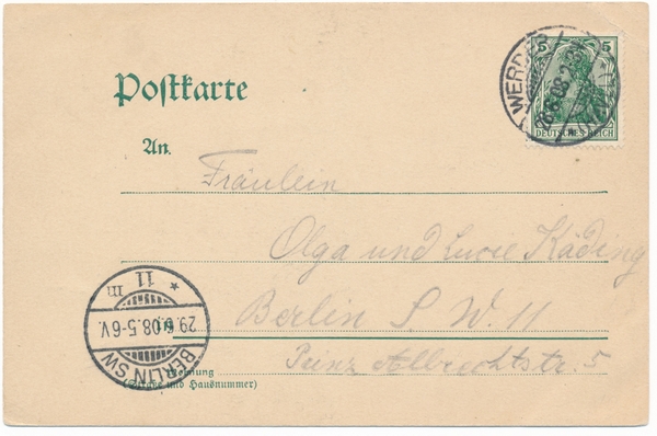 Text auf der Karte: Gruss aus Ferch: Sommerfest des Academischen Architekten-Vereins Berlin 27.VI.08 (mit Zeichnung der Heiligegeistkirche Potsdam) Entstehungszeit der Karte: gestempelt Werder 28.06.1908 Kartenart: Ansichtskarte Kartentechnik: SW-Litho Verlag: unbekannt Gelaufen/ungelaufen: gelaufen Zustand (I=sehr gut bis V=mangelhaft): I Häufigkeit (h=häufig bis rrr=sehr selten): r