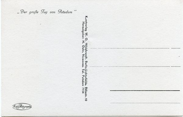 Text auf der Karte: Potsdam 21.3.1933. Reichspräsident von Hindenburg begibt sich in die Nikolaikirche. Entstehungszeit der Karte: 1933 Kartenart: Ansichtskarte Kartentechnik: SW-Foto Verlag: Kunstverlag W. G. Hildebrandt, Berlin-Lichterfelde, Bäkestr.10 Herausgeber: H. Gerber, Nowawes, Tel. Potsdam 7154 Gelaufen/ungelaufen: ungelaufen Zustand (I=sehr gut bis V=mangelhaft): I Häufigkeit (h=häufig bis rrr=sehr selten): h