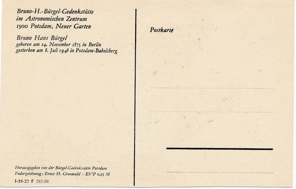 Text auf der Karte: Bruno-H. Bürgel (nach einer Federzeichnung von Ernst H. Grunwald) Entstehungszeit der Karte: ca. 1981 Kartenart: Ansichtskarte Kartentechnik: Druck Verlag: Herausgegeben von der Bürgel-Gedenkstätte Potsdam Gelaufen/ungelaufen: ungelaufen Zustand (I=sehr gut bis V=mangelhaft): I Häufigkeit (h=häufig bis rrr=sehr selten): h