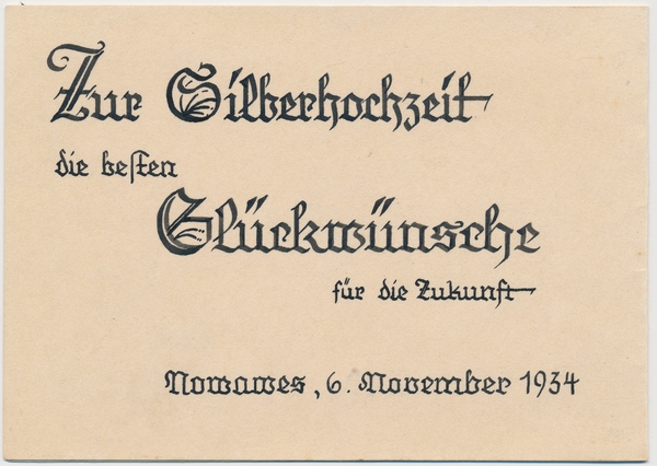 Text auf der Karte: N. S. Hago (Handels- und Gewerbeorganisation), Ortsgruppe Nowawes, Heil Hitler, Zur Silberhochzeit die besten Glückwünsche Entstehungszeit der Karte: geschrieben Nowawes 06.11.1934 Kartenart: Grußkärtchen Kartentechnik: SW-Druck Verlag: unbekannt Gelaufen/ungelaufen: gelaufen Zustand (I=sehr gut bis V=mangelhaft): I Häufigkeit (h=häufig bis rrr=sehr selten): r