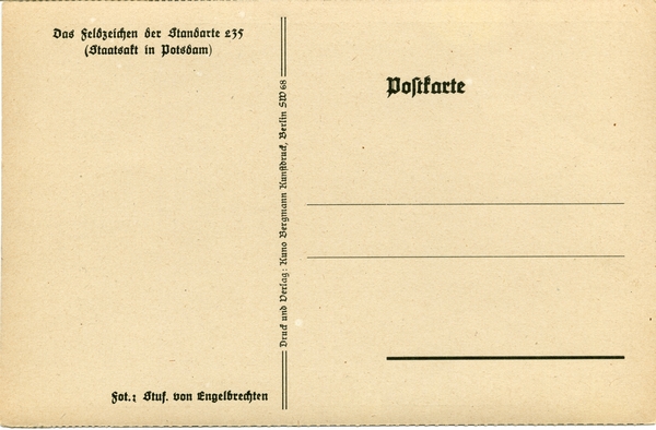 Text auf der Karte: Das Feldzeichen der Standarte 235 (Staatsakt in Potsdam) Entstehungszeit der Karte: 1933 Kartenart: Ansichtskarte Kartentechnik: SW-Foto Verlag: Druck und Verlag: Kuno Bergmann Kunstdruck, Berlin SW 68 Gelaufen/ungelaufen: ungelaufen Zustand (I=sehr gut bis V=mangelhaft): I Häufigkeit (h=häufig bis rrr=sehr selten): r