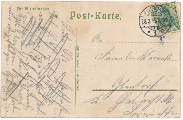 Text auf der Karte: Es lebe hoch das Regiment, Das sich mit Stolz 3. Garde Ulanen nennt! Entstehungszeit der Karte: gestempelt Potsdam 28.03.1913 Kartenart: Ansichtskarte Kartentechnik: Farblitho Verlag: Verlag v. W. Steinberg, Breslau. Gelaufen/ungelaufen: gelaufen Zustand (I=sehr gut bis V=mangelhaft): I Häufigkeit (h=häufig bis rrr=sehr selten): r