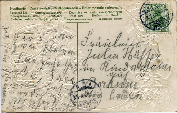 Text auf der Karte: Zur Erinnerung an die Vermählung des deutschen Kronprinzen Friedrich Wilhelm v. Preussen mit Herzogin Cecilie v. Mecklenburg-Schwerin am 6. Juni 1905 Entstehungszeit der Karte: gestempelt 03.07.1905 Kartenart: Ansichtskarte Kartentechnik: Prägekarte Verlag: unbekannt Gelaufen/ungelaufen: gelaufen Zustand (I=sehr gut bis V=mangelhaft): I Häufigkeit (h=häufig bis rrr=sehr selten): h