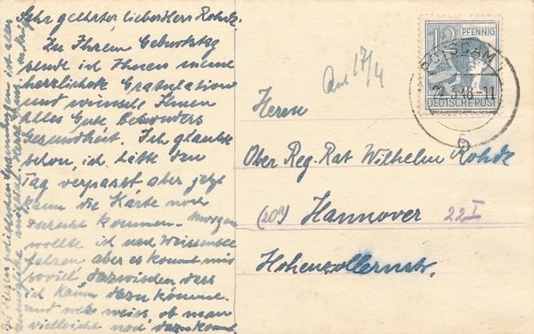 Text auf der Karte: Haus in Potsdam? Entstehungszeit der Karte: gestempelt Potsdam 22.03.1948 Kartenart: Ansichtskarte Kartentechnik: SW-Foto Verlag: unbekannt Gelaufen/ungelaufen: gelaufen Zustand (I=sehr gut bis V=mangelhaft): I Häufigkeit (h=häufig bis rrr=sehr selten): r