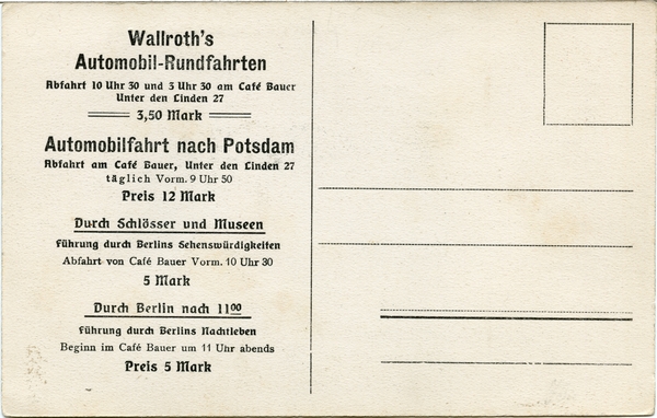 Text auf der Karte: Wallroth's Ausflug nach Potsdam - Wannsee Entstehungszeit der Karte: ca. 1906 Kartenart: Geschäftskarte Kartentechnik: SW-Litho Verlag: unbekannt Gelaufen/ungelaufen: ungelaufen Zustand (I=sehr gut bis V=mangelhaft): I Häufigkeit (h=häufig bis rrr=sehr selten): r Kommentar: Bei diesem Decksitzer-Omnibus handelt es sich höchstwahrlich um einen Bus der Firma Stoewer, Stettin. Das Baujahr müsste ca. 1906 sein. Die Stoewer Busse am Anfang des 20. Jahrhunderts trugen noch kein Firmenlogo am Kühler, obwohl es bereits eines gab (Auskunft Manfred Bauer vom Stoewer-Museum am 21.01.2013). Das Nummernschild mit den Anfangsbuchstaben IA gehörte zum Landespolizeibezirk Berlin. Im Hintergrund ist der Wannsee in der Nähe des S-Bahnhofs Wannsee zu sehen.