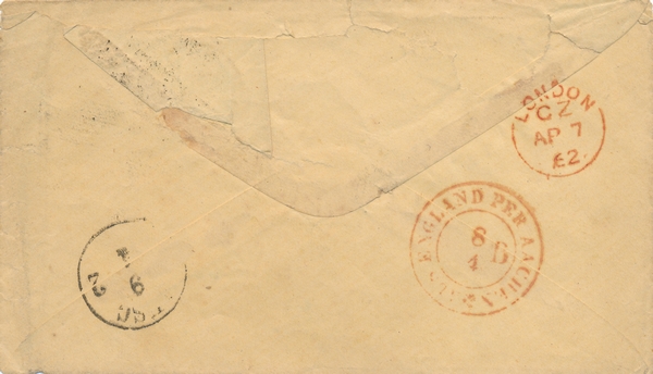 Text auf der Karte: Kuvert an Herrn Dahse zu Potsdam, Königreich Preussen, aus Liverpool Entstehungszeit der Karte: gestempelt Liverpool 06.04.1862 Kartenart: Kuvert Kartentechnik: Papier Verlag: unbekannt Gelaufen/ungelaufen: gelaufen Zustand (I=sehr gut bis V=mangelhaft): II Häufigkeit (h=häufig bis rrr=sehr selten): r