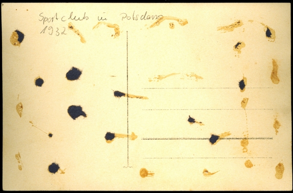 Text auf der Karte: Tennisverein in Potsdam? Entstehungszeit der Karte: ca. 1932 Kartenart: Fotokarte Kartentechnik: SW-Foto Verlag: unbekannt Gelaufen/ungelaufen: ungelaufen Zustand (I=sehr gut bis V=mangelhaft): II Häufigkeit (h=häufig bis rrr=sehr selten): r Heutige(r) Straßenname(n): Heinrich-Mann-Allee (Teltower Vorstadt) Kommentar: Im Giebel ist eine Fahne erkennbar, die die Buchstaben S.C.P. Z. trägt.
