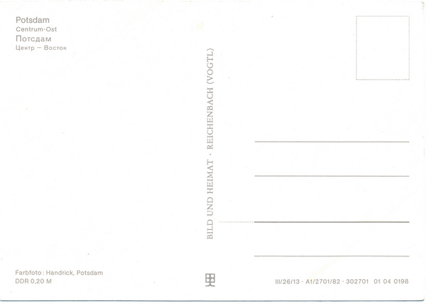 Text auf der Karte: Potsdam Centrum-Ost Entstehungszeit der Karte: ca. 1982 Kartenart: Ansichtskarte Kartentechnik: SW-Foto Verlag: Foto: Handrick, Potsdam; Bild und Heimat, Reichenbach (Vogtl.) Gelaufen/ungelaufen: ungelaufen Zustand (I=sehr gut bis V=mangelhaft): II Häufigkeit (h=häufig bis rrr=sehr selten): h Heutige(r) Straßenname(n): Humboldtring