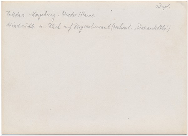 Text auf der Karte: Hübners Mühle in Werder Entstehungszeit der Karte: ca. 1920 Kartenart: Ansichtskartenvorlage 13x18 Kartentechnik: SW-Foto Verlag: Max Hochgeladen, Potsdam Gelaufen/ungelaufen: ungelaufen Zustand (I=sehr gut bis V=mangelhaft): I Häufigkeit (h=häufig bis rrr=sehr selten): r Kommentar: Die Mühle brannte Anfang der 1990er Jahre ab.