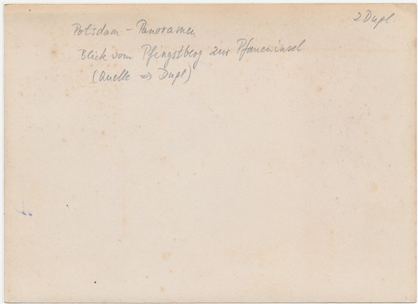 Text auf der Karte: Potsdam Blick vom Pfingstberg nach der Pfaueninsel zu Entstehungszeit der Karte: ca. 1920 Straße und Hausnummer: Pfingstberg Kartenart: Ansichtskartenvorlage 13x18 Kartentechnik: SW-Foto Verlag: Max Hochgeladen, Potsdam. Gelaufen/ungelaufen: ungelaufen Zustand (I=sehr gut bis V=mangelhaft): I Häufigkeit (h=häufig bis rrr=sehr selten): r
