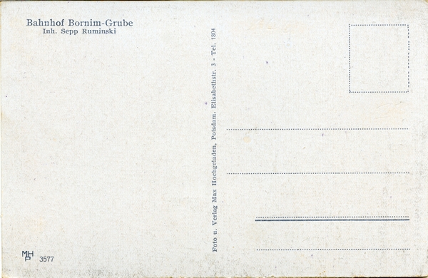 Text auf der Karte: Kirche. Blick auf Grube. Bahnhof. Rückseitig: Bahnhof Bornim-Grube Inh. Sepp Ruminski Entstehungszeit der Karte: gestempelt 13.09.1943 Straße und Hausnummer: Am Bahnhof Kartenart: Ansichtskarte Kartentechnik: SW-Foto Verlag: MHP 3577 Foto u. Verlag Max Hochgeladen, Potsdam, Elisabethstr. 3- Tel. 1804 Gelaufen/ungelaufen: gelaufen Zustand (I=sehr gut bis V=mangelhaft): III Häufigkeit (h=häufig bis rrr=sehr selten): h