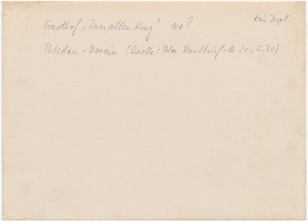 Text auf der Karte: Bornim (Mark) Restaurant "Zum alten Krug" Entstehungszeit der Karte: ca. 1920 Straße und Hausnummer: Potsdamer Straße 65 Kartenart: Ansichtskartenvorlage 13x18 Kartentechnik: SW-Foto Verlag: Max Hochgeladen Gelaufen/ungelaufen: ungelaufen Zustand (I=sehr gut bis V=mangelhaft): I Häufigkeit (h=häufig bis rrr=sehr selten): r Heutige(r) Straßenname(n): Potsdamer Straße (Bornim) Kommentar: Das Denkmal für dieses Regiment wurde vom Bildhauer Hand Hubert Dietzsch-Sachsenhausen entworfen. Die feierliche Einweihung fand am 17. Mai 1923 statt. Das bronzene Reiterdenkmal befand sich an der Ecke Jägeralle/Reiterweg (Königsweg), am Rande der russischen Kolonie Alexandrowka. Über sein Schicksal - ob im Rahmen der Metallspende vor 1945 entfernt und eingeschmolzen oder erst nach dem 8. Mai 1945 vernichtet - ist vorläufig nichts bekannt. Als einziges Überbleibsel des Denkmals existiert noch der Betonsockel. (Quelle: Bauer, Frank u. Knitter, Hartmut u. Ruppert, Heinz Vernichtet - Vergessen - Verdrängt Militärbauten und militärische Denkmäler in Potsdam, Verlag E. S. Mittler & Sohn, Berlin, Bonn, Herford, 1993, Seite 160)